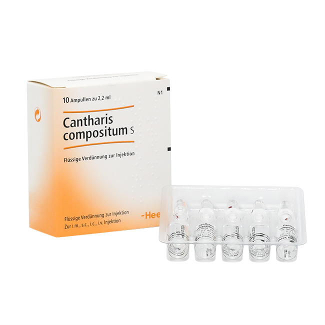 Cantharis compositum S также может назначаться при цистите, вызванном лучевой терапией, для снятия раздражений, судорог мочевого пузыря, для снятия колющих и жгучих болей при мочеиспускании. В тех случаях, когда боли отдаются в ноги, особенно в правую, показаны подкожные инъекции смеси с Polypus vesicae urinariae-Injeel (+forte), Arsenicum album-Injeel forte, Argentum nitricum-Injeel forte, сначала ежедневно, потом — 2-3 раза в неделю.