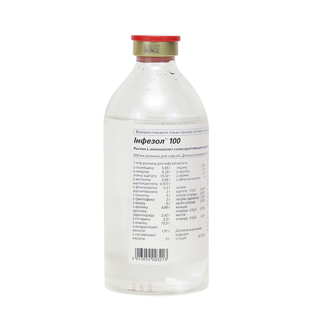 Инфезол 100 – это комплексный инфузионный препарат, содержащий сбалансированный набор аминокислот и электролитов. Обеспечивает энергетическую и пластическую поддержку организма.