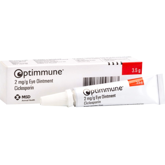 Optimmune — глазная мазь на основе циклоспорина A, предназначенная специально для собак с хроническими поверхностными заболеваниями глаз (например, кератит сухого глаза). Циклоспорин A в концентрации 2 мг/г подавляет локальные иммунные реакции, нормализует слезоотделение и способствует восстановлению целостности роговицы.
